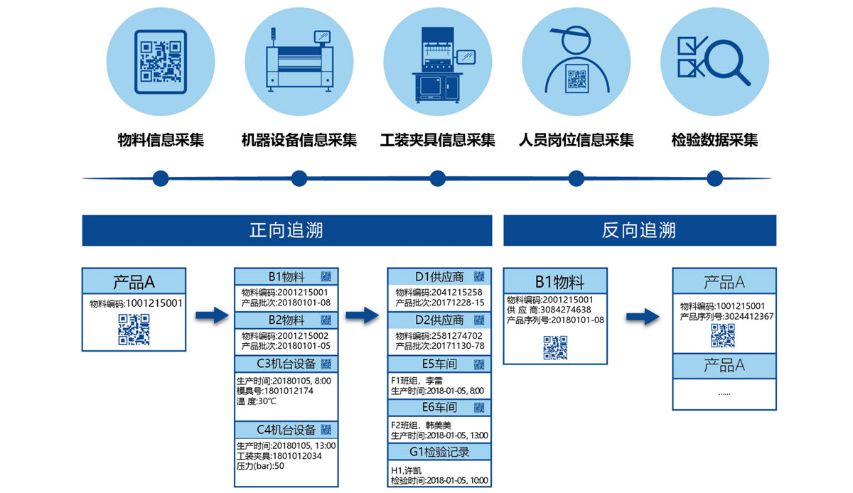 制造过程的全追溯可分为正向追溯和反向追溯两部分。 我们在整个过程中收集有关生产过程中涉及的每个角色的信息。 使用大数据,可以从成品到材料、供应商、从材料进行追溯。 追溯至成品。 能快速发现生产过程中的问题点,为客户提供优质的产品。